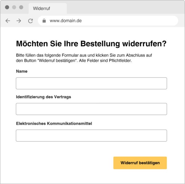 Das Onlineformular ist abzuschließen mit dem Button „Widerruf bestätigen“ oder einer gleichwertigen Buttonbeschriftung (§ 356a Abs. 3 BGB).